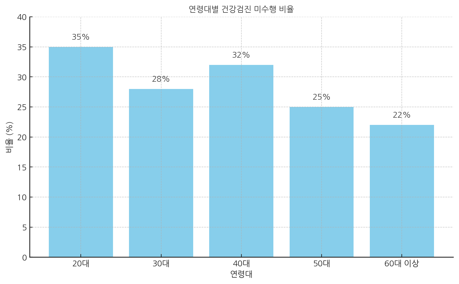 아래 그래프에서 볼 수 있듯이, 20~40대의 건강검진 미수행 비율이 높다는 점은 우리 사회가 예방보다는 치료에만 집중하고 있다는 경고일 수 있습니다. 특히 20대는 35%, 40대는 32%에 달해, 가장 활발히 활동하는 시기임에도 불구하고 건강관리에 소홀한 경우가 많습니다.