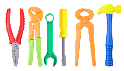 다양한 색상의 장난감 공구 세트. 빨간 펜치, 주황색 파이프렌치, 초록색 렌치, 노란 드라이버, 주황색 펜치, 파란색과 노란색 망치가 일렬로 놓여 있다. 3. 계절별 옷 몇 벌