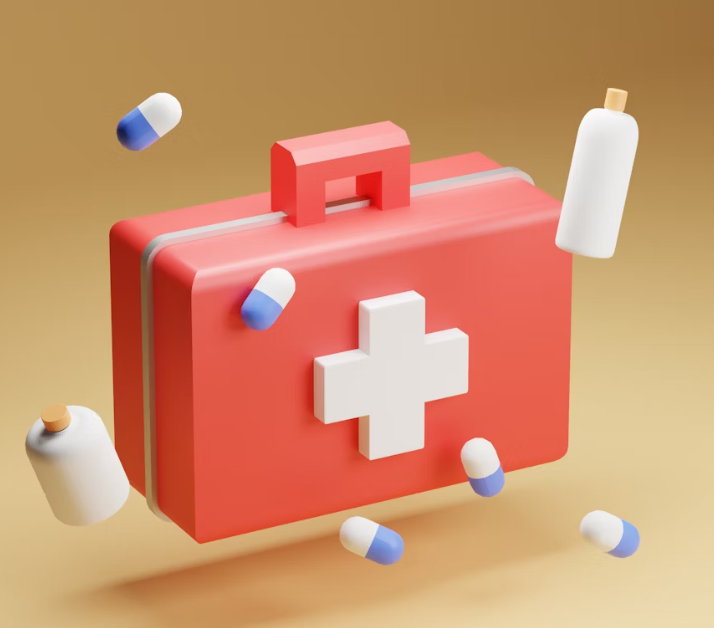 빨간색 구급상자 일러스트. 중앙에 흰색 십자 표시가 있고, 주변에 파란색과 흰색 알약 캡슐과 흰색 약병들이 떠 있다. 5. 중요한 원본 서류