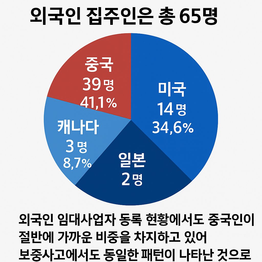 HUG가 대위변제를 실시한 외국인 집주인은 총 65명. 이 가운데 **중국 국적이 39명(41.1%)**으로 가장 많았고, 미국 14명(34.6%), 캐나다 3명(8.7%), 일본 2명 순으로 나타났습니다. 외국인 임대사업자 등록 현황에서도 중국인이 절반에 가까운 비중을 차지하고 있어, 보증사고에서도 동일한 패턴이 나타난 것으로 분석됩니다.